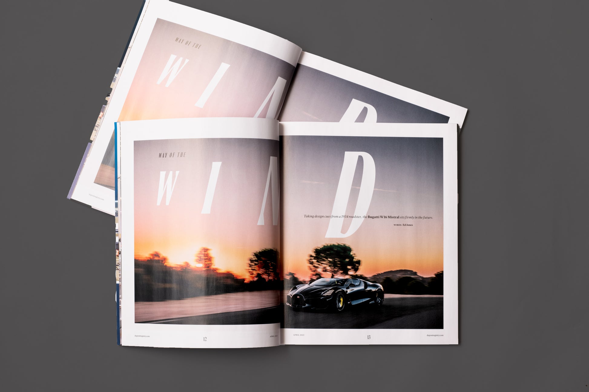 One thing about them, however, has remained constant: their quad-turbo W16 engine. In the original Veyron, this 16-cylinder, 8.0-liter mill produced 987 horsepower. Now, near the end of its run, it makes 1,577 hp. The final resting place of the legendary W16 is this month’s cover car, the Bugatti Mistral, which will be the last road-going Bugatti ever to feature this engine of engines.