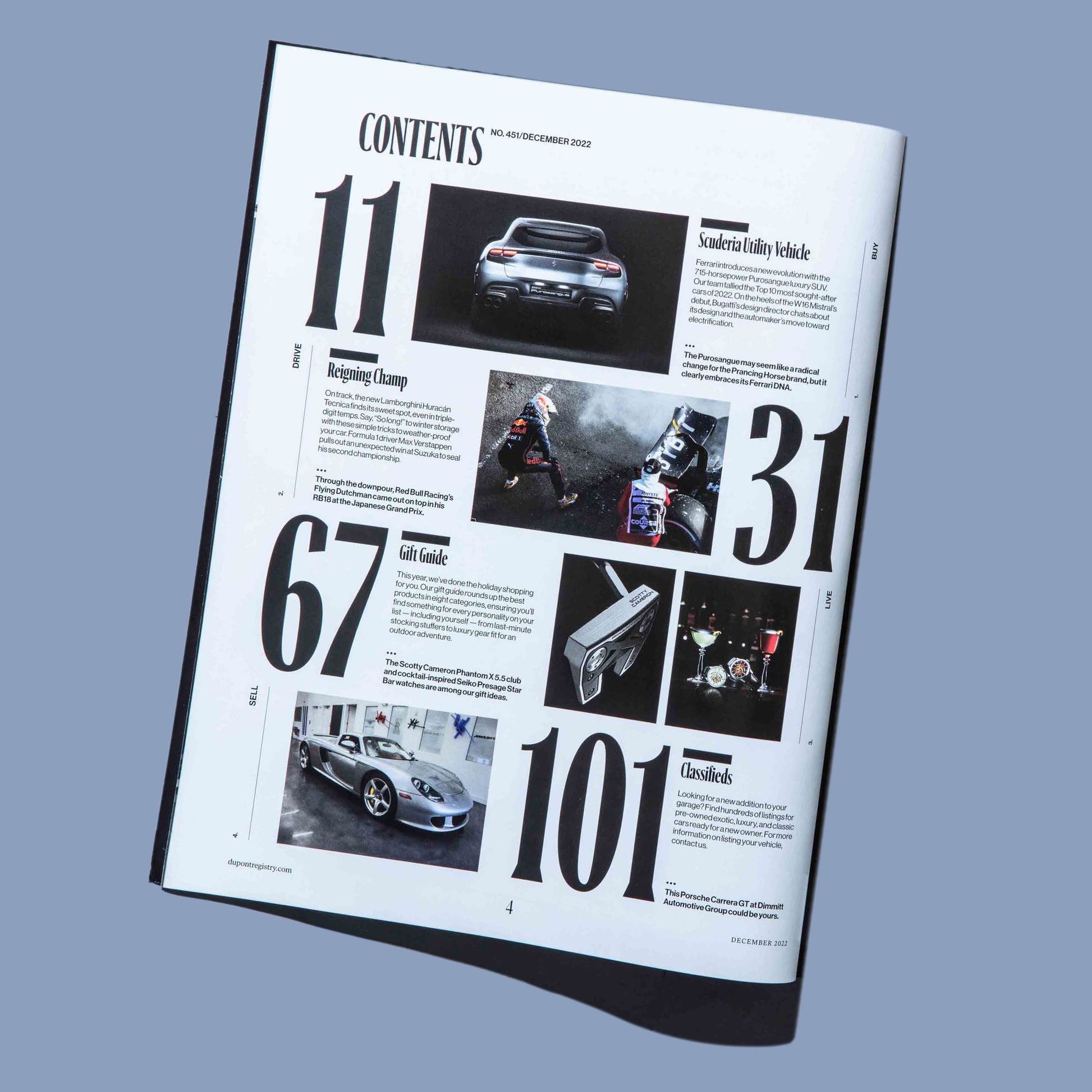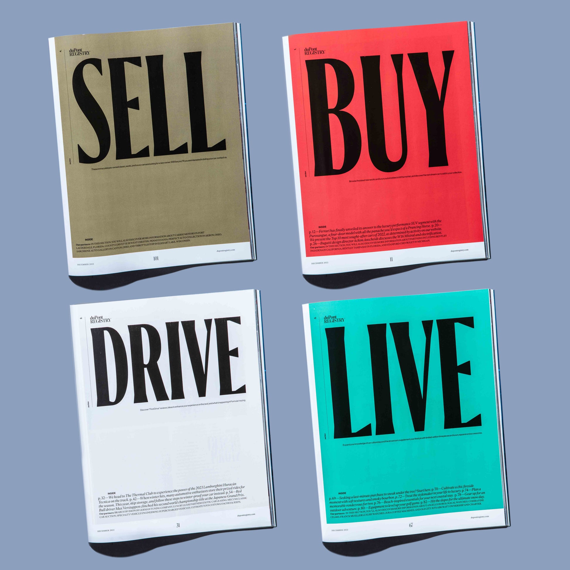 Inside the NEW duPont REGISTRY magazine is an all-new layout that features four distinct sections: Buy, Drive, Live and Sell. These following along the exotic car ownership experience and feature original editorial.