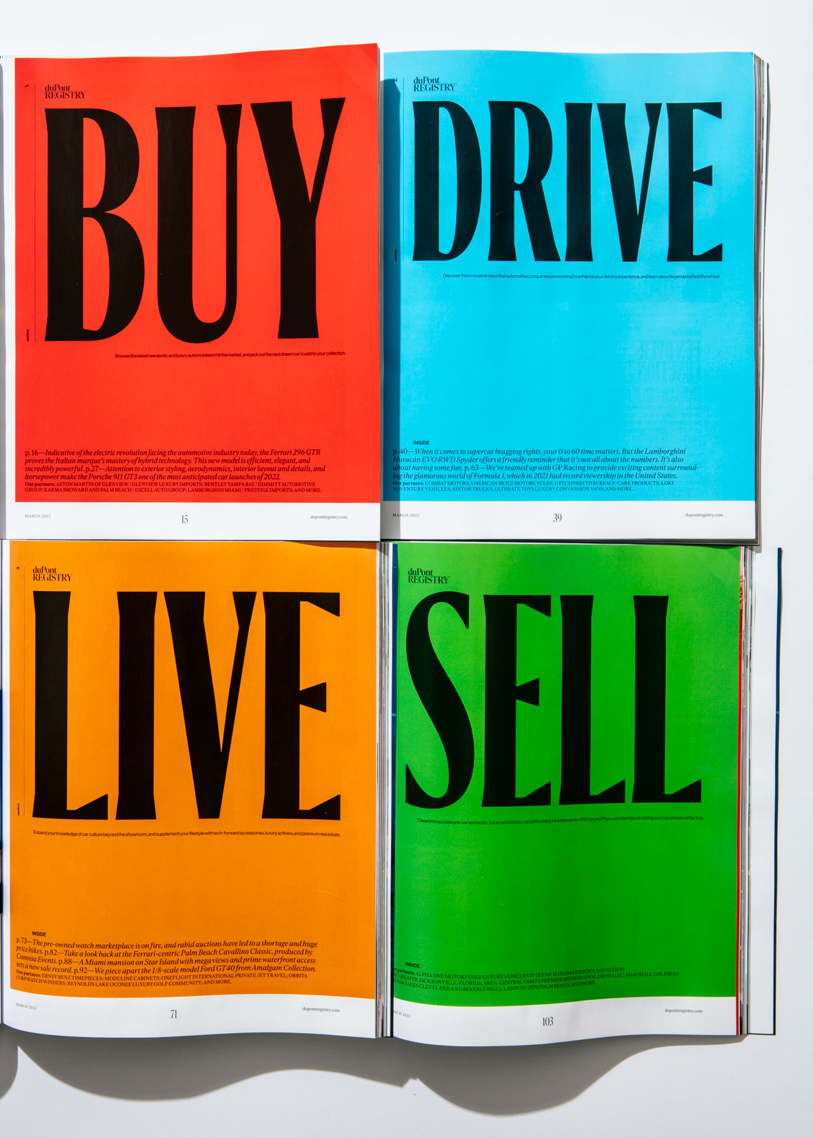 Inside the NEW duPont REGISTRY magazine is an all-new layout that features four distinct sections: Buy, Drive, Live and Sell. These following along the exotic car ownership experience and feature original editorial.