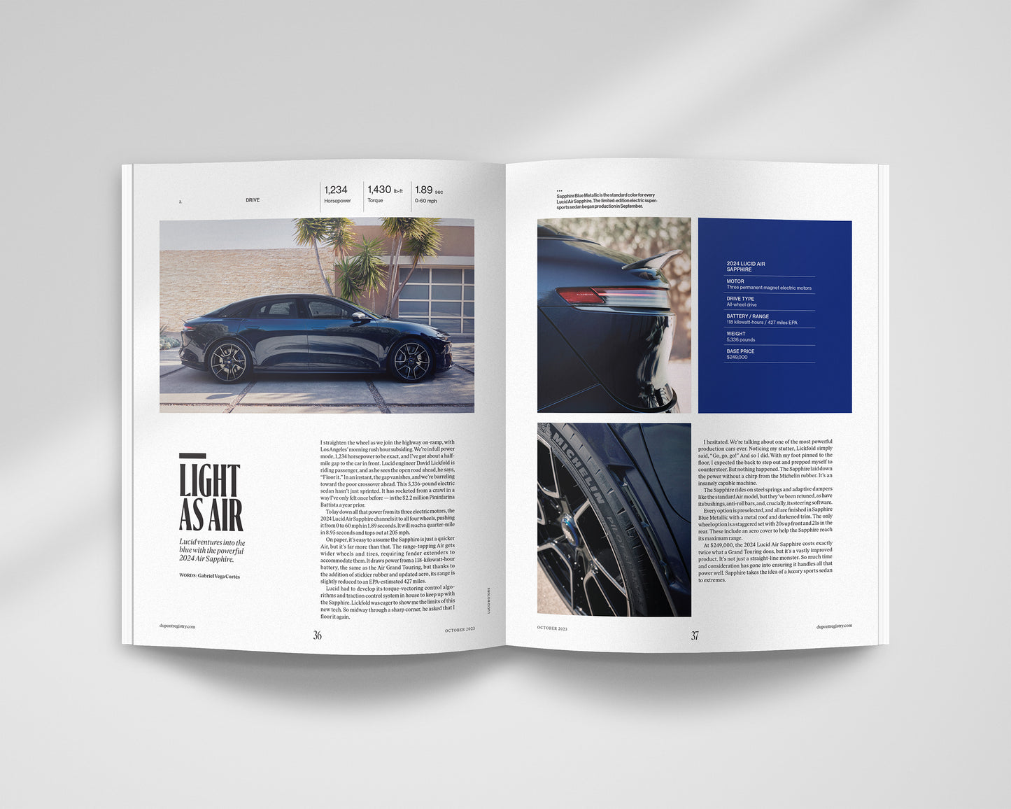 Our other drive report is of a car that has nearly twice the horsepower of the Z06, but doesn’t look like it. The new Lucid Air Sapphire boasts a satisfyingly ordered 1,234 horsepower, a quarter-mile time below 9 seconds, and a top speed of 205 mph. It laughs at the Tesla Model S Plaid and welcomes a fight with mid-engined supercars like the Z06 (though it may not find a race with the electrified Corvette E-Ray quite as easy).