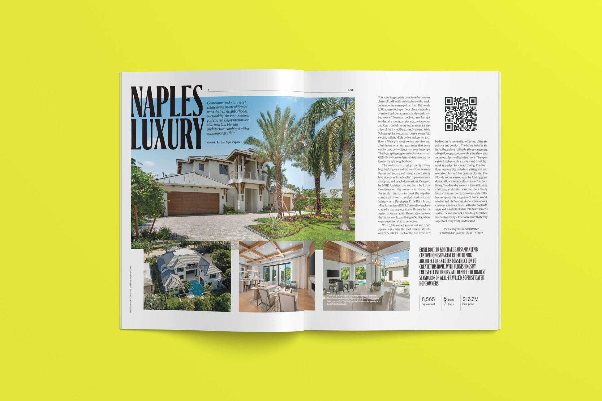 This month's LIVE section highlights a breathtakingly luxurious home for sale in Naples, FL. This stunning property combines the timeless charm of Old Florida architecture with sleek, contemporary cosmopolitan flair. You can read more details on the property on page 80.